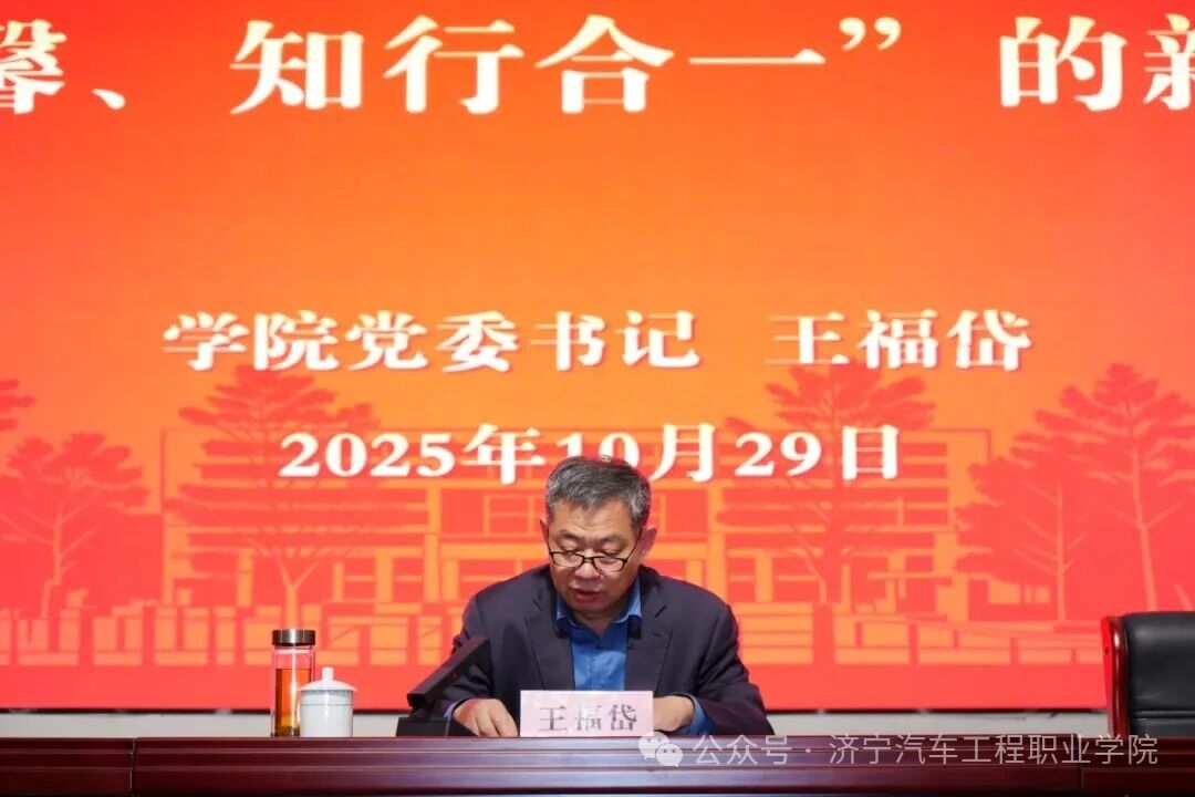 10月29日下午,校党委书记王福岱在报告厅为全体师生上思想政治课。本次思政课的主题是学习贯彻党的二十届四中全会精神,做“德技双馨、知行合一”的新时代大学生。学校董事长徐明辉,校长刘翠兰、副校长于瑞华、监事长金诚,以及省派党建联络员李永健、蔡军,全校师生参加了思政课。