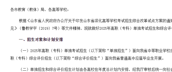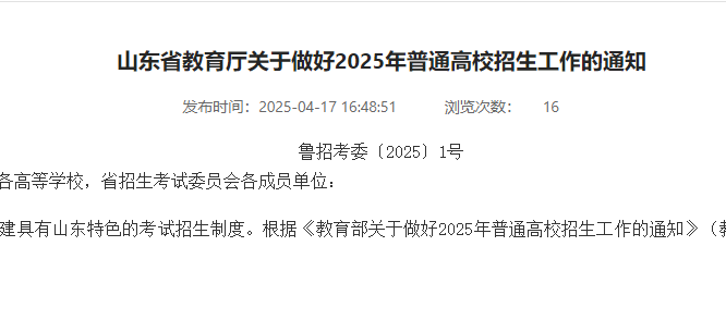 山东省招生考试委员会关于做好2025年普通高校招生工作的通知鲁招考委〔2025〕1号各市招生(考试)委员会、教育(教体)局,各高等学校,省